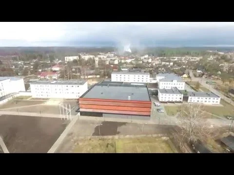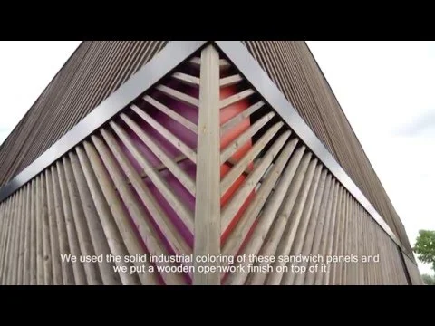 serve as a municipal sports centre. The hall's front, which is finished with colourful metal walls cladded with timber, combines nicely with the nearby forest skyline. The seethrough timber paneling and the varying facade colours create a dynamic, sporty feeling when walking alongside the building.